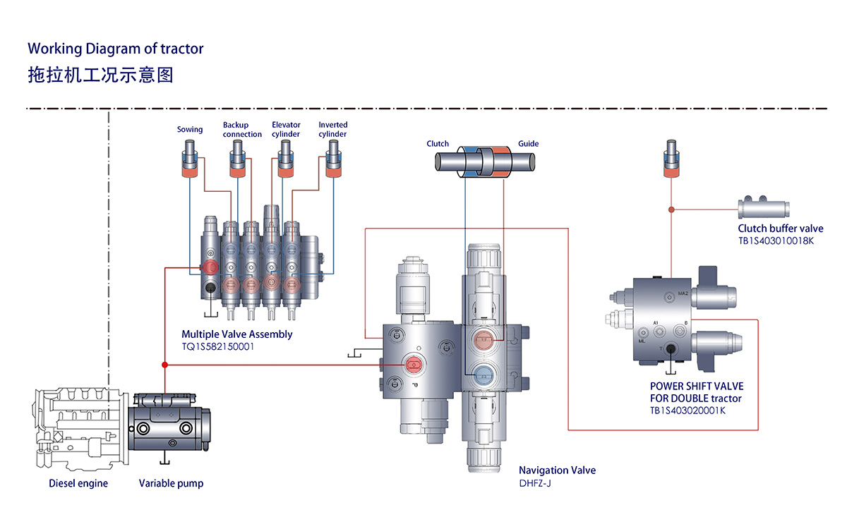 1、由變量柱塞泵、負載敏感電比例多路閥、轉(zhuǎn)向器、電控手柄、高精度傳感器、動力換擋、控制器等組成,可提供70~220馬力拖拉機成套負載敏電液比例系統(tǒng)