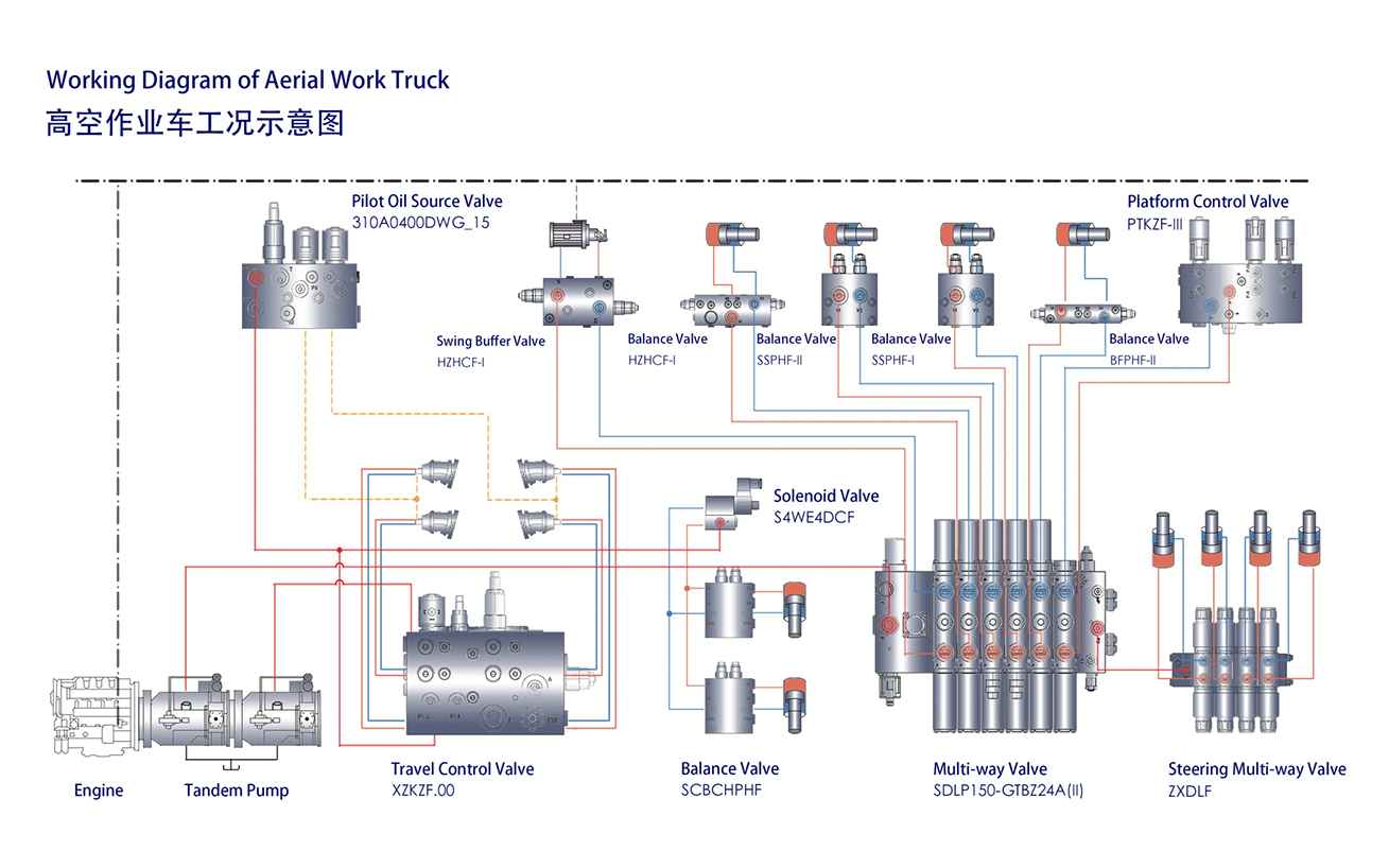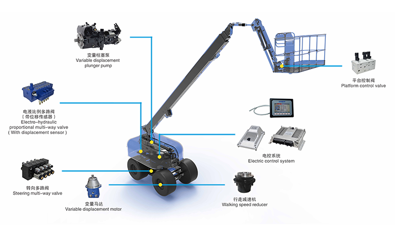 3. 實現(xiàn)整車行駛與轉(zhuǎn)向、臂架變幅伸縮、轉(zhuǎn)臺回轉(zhuǎn)、平臺自動調(diào)平等動作,無級調(diào)速,啟停平順、響應(yīng)迅速、動作平穩(wěn)、微動性好。
